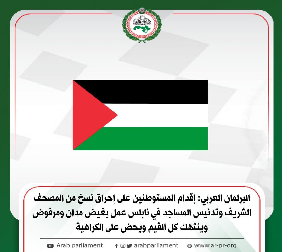 البرلمان العربي: إقدام المستوطنين على إحراق نسخ من المصحف الشريف وتدنيس المساجد في نابلس عمل بغيض مدان ومرفوض وينتهك كل القيم ويحض على الكراهية