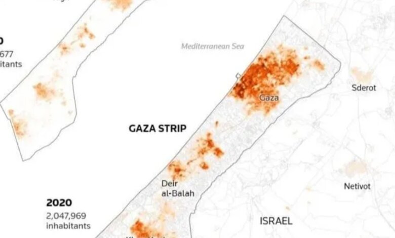 وعكست الخرائط كثافة سكانية مرتفعة في الشمال قياسا ببقية مناطق القطاع، والتي دعت إسرائيل إلى إخلائها والتوجه جنوب وادي غزة.