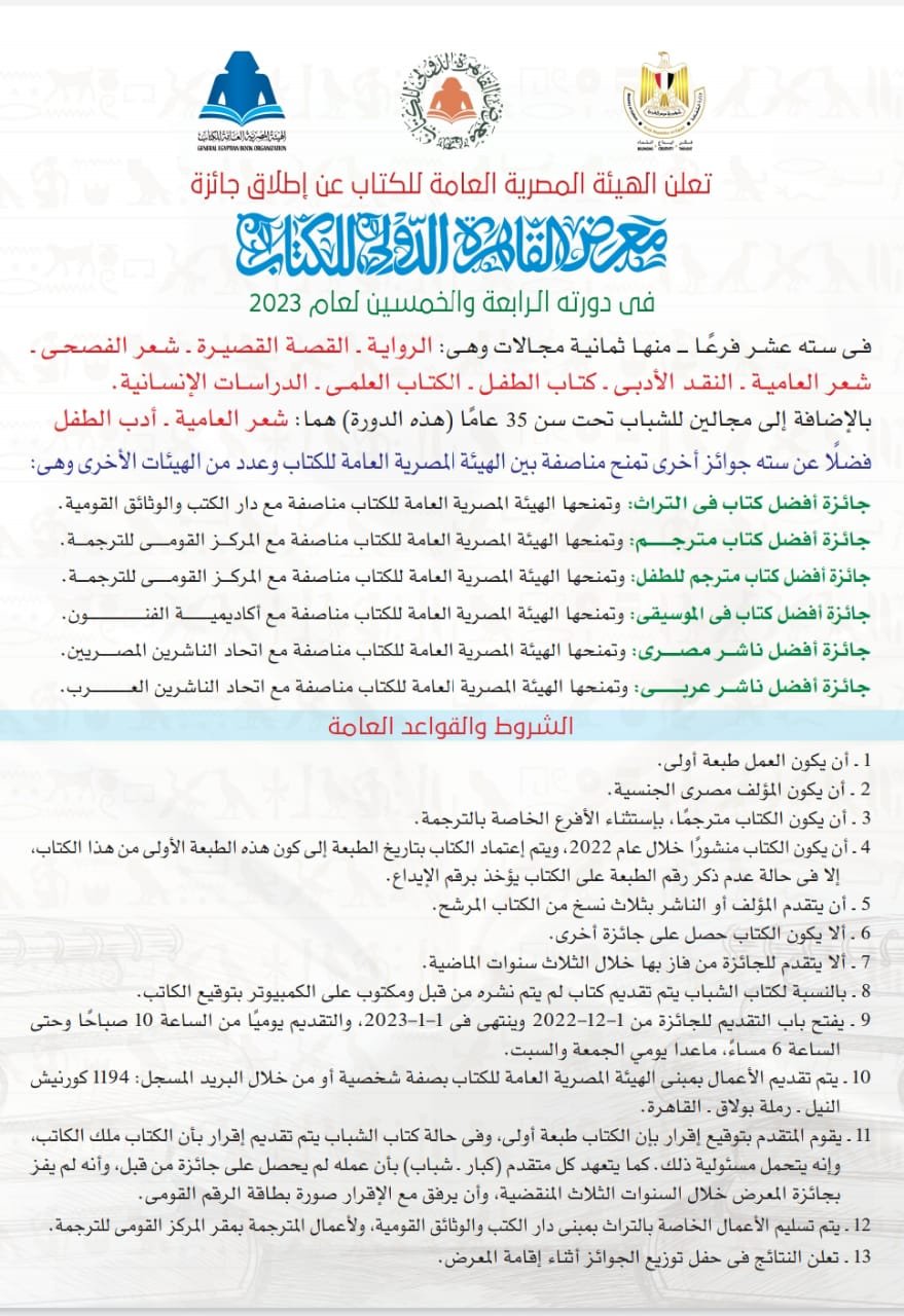 تعلن الهيئة المصرية العامة للكتاب عن، فتح باب التقدم لجوائز «معرض القاهرة الدولي للكتاب» في دورته الرابعة والخمسين لعام 2023، والمقرر انطلاقه نهاية يناير المقبل.