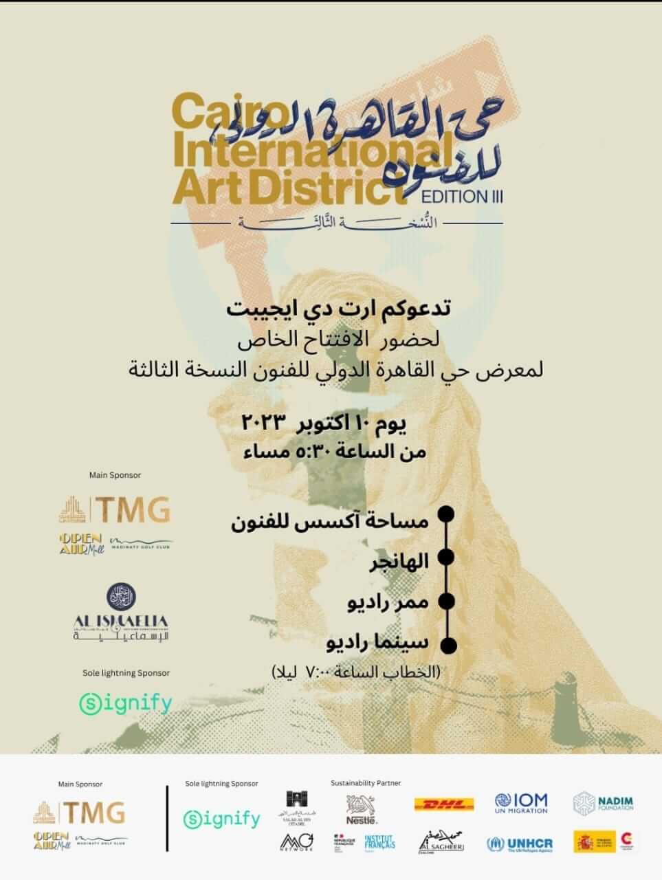 تنظم أرت دي إيجيبت النسخة الثالثة من المعرض حي القاهرة الدولي للفنون في ٤ مناطق في وسط البلد، وهي “أكسس آرت سبيس”، و”سينما راديو” و”ممر راديو” و”الهنجر” وهي معارض جماعية مفتوحة للجمهور يوميا ماعدا يوم الاتنين من الساعة 10 صباحا حتي 10 مساءا، من يوم 10 أكتوبر وحتي 30 أكتوبر.