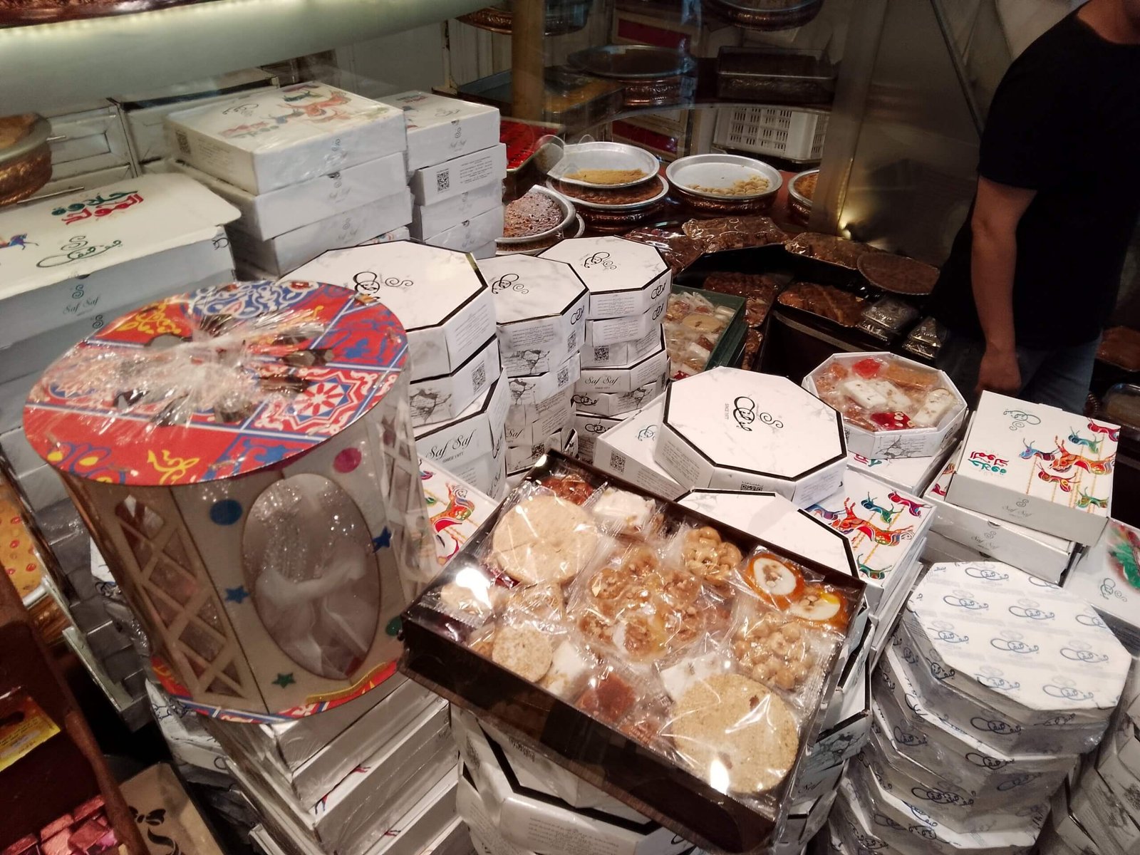 كما أوضح أن أكثر أنواع الحلوي في البيع هي العلف بجميع أنواعه ، وايضا انواع المربي المصنعة في حلوي المولد ، ونحرص في تجهيز العلب المغلفة للحلوي أن ترضي جميع الاذواق وتشمل أصناف الحلوي المختلفة .
