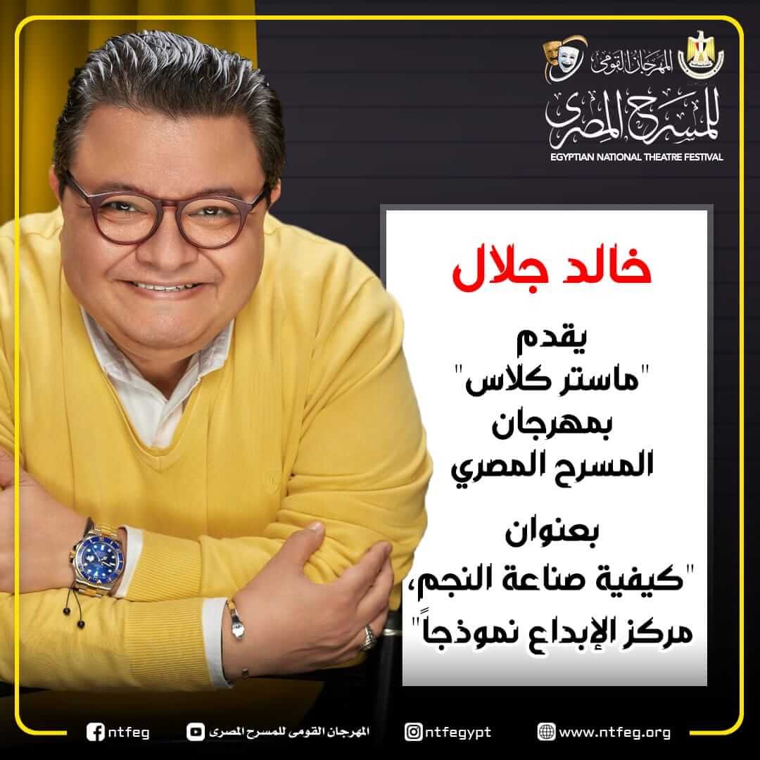 يقدم المهرجان القومي للمسرح المصري في دورته السادسة عشرة برئاسة الفنان محمد رياض ولأول مرة “ماستر كلاس” للفنان والمخرج الكبير خالد جلال تحت عنوان ( كيفية صناعة النجم .. مركز الابداع نموذجا ) .