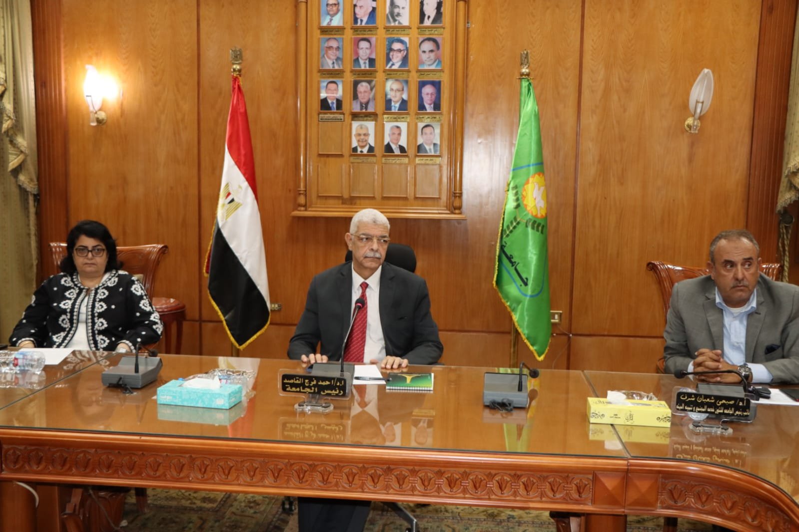 إجتمع الدكتور أحمد القاصد رئيس جامعة المنوفية بمسئولين من شركة المقاولين العرب فرع الدلتا والمسند إليهم أعمال تعلية مستشفى الطوارئ بحضور الدكتورة نانسى أسعد نائب رئيس الجامعة لشئون التعليم والطلاب، المحاسب جلال عبد السلام أمين عام الجامعة، والدكتور أيمن عبد الحميد المستشار الهندسى لرئيس الجامعة، والدكتور ناصر عبدالبارى عميد كلية الطب.