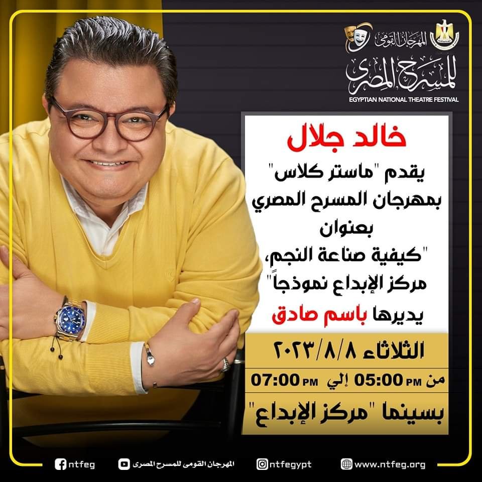 ضمن فعاليات المهرجان القومي للمسرح المصري في دورته السادسة عشرة برئاسة الفنان محمد محمود ، قدم المهرجان القومي لأول مرة، يقدم المخرج خالد جلال، “ماستر كلاس” تحت عنوان (كيفية صناعة النجم)، في تمام الساعة الخامسة مساء بمركز الإبداع الفني.