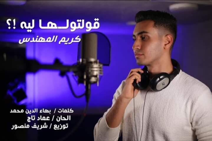 طرح المطرب الشاب كريم المهندس أحدث أغانيه بعنوان «قولتولها ليه» على طريقة الفيديو كليب، مصاحباً بث كلماتها عبر موقع الفيديوهات الشهير اليوتيوب، وتم بثها أيضًا على أحد تطبيقات الأغانى وجميع وسائل التواصل الإجتماعى المختلفة، حيث تخطت حاجز ال «150000» مشاهدة خلال 24 ساعة، مما قدد نالت استحسان وإعجاب وثناء الجمهور ومن المتوقع المزيد من المشاهدات خلال الفترة المقبلة.