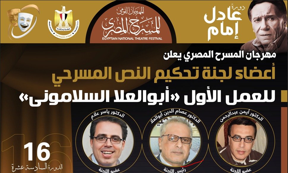 كشفت إدارة المهرجان القومي للمسرح المصري برئاسة الفنان محمد رياض، عن أسماء لجنة تحكيم النص المسرحي للعمل الأول والتي أطلق عليها في الدورة السادسة عشرة اسم الكاتب الكبير الراحل محمد أبو العلا السلاموني، تكريما وتخليدا لاسمه .