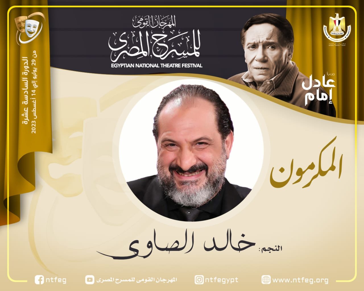 يكرم المهرجان القومي للمسرح المصري في دورته السادسة عشرة، برئاسة الفنان محمد رياض، النجم خالد الصاوي، عن مجمل مسيرته الفنية، واسهاماته في المسرح المصري خلال حفل الافتتاح يوم السبت 29 يوليو .
