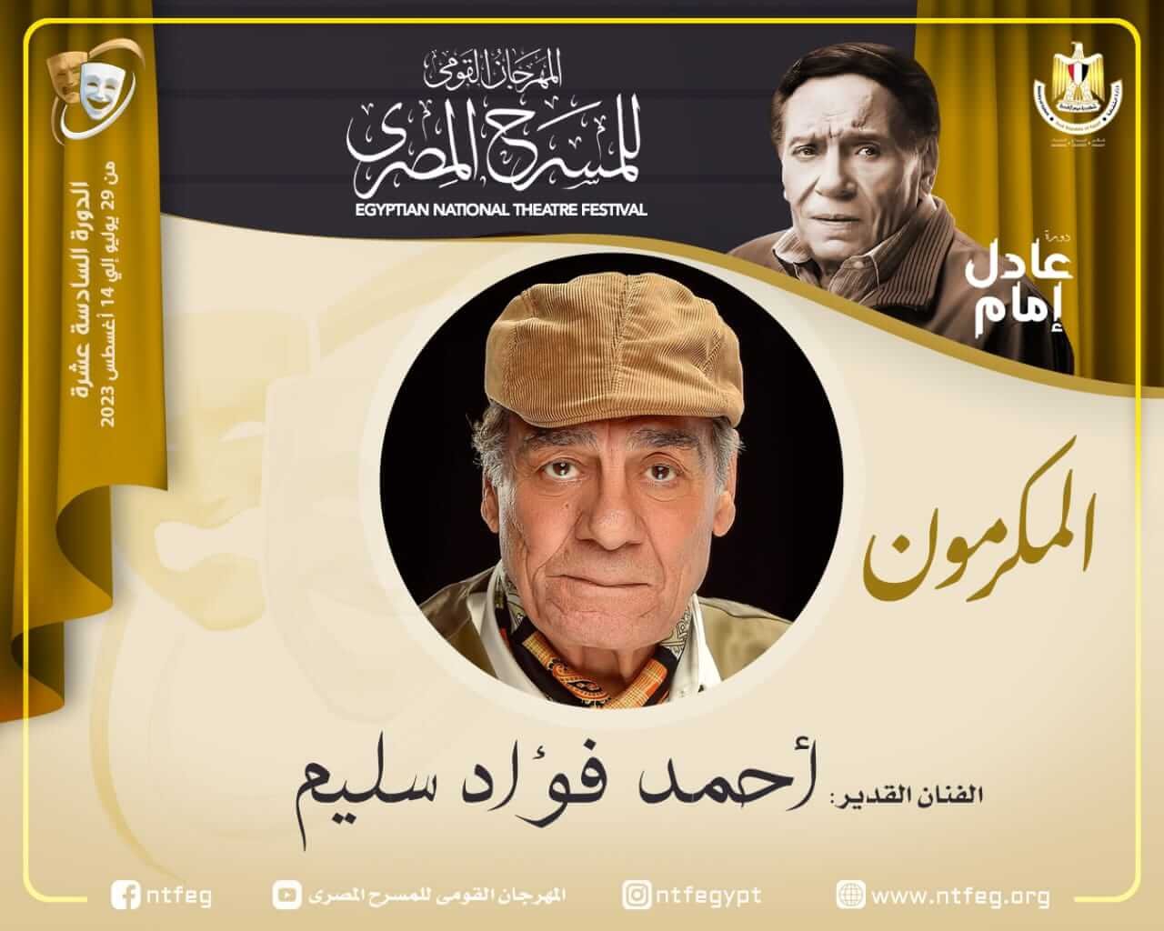 يكرم المهرجان القومي للمسرح المصري، برئاسة الفنان محمد رياض، في حفل افتتاح دورته السادسة عشرة، الفنان الكبير أحمد فؤاد سليم، وذلك تقديرا لمشواره الفني بشكل عام، والمسرحي بشكل خاص.